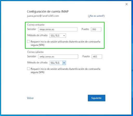 Si configuras una cuenta IMAP, introduce el servidor de correo entrante imap.ionos.es en el campo Servidor del área Correo entrante. Introduce el puerto 993 en el campo correspondiente y selecciona SSL/TLS en la lista Método de cifrado.
