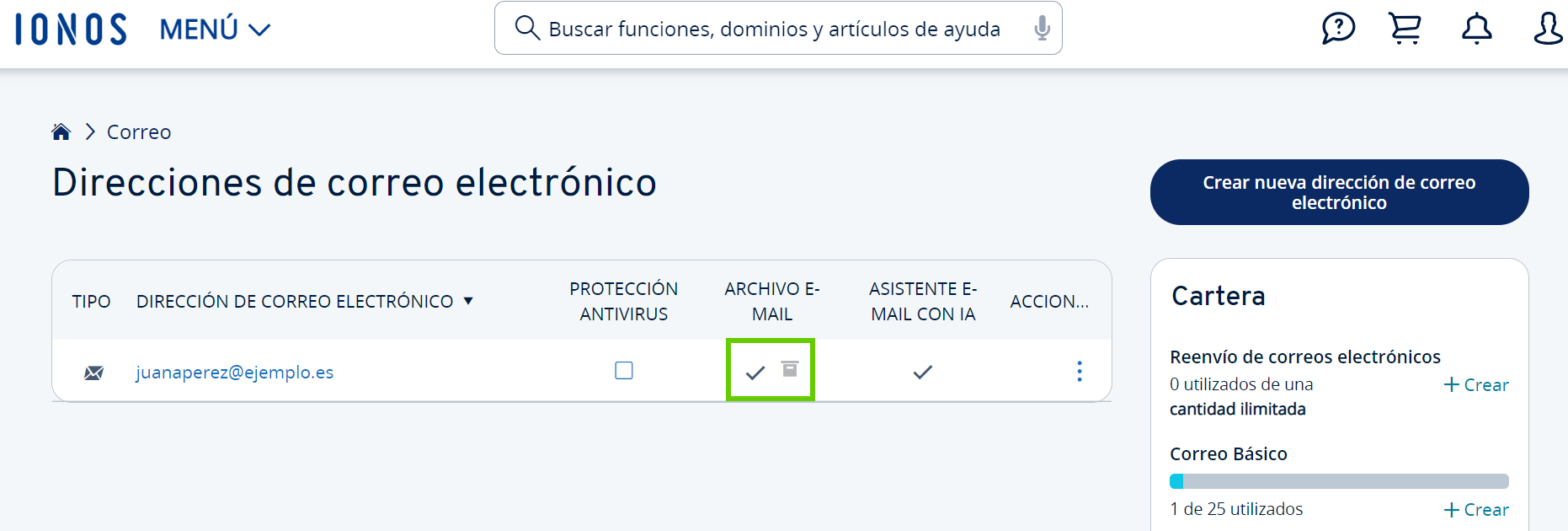 - Abre Archivo de e-mail como administrador. Para ello, haz clic en el icono de archivo de correo electrónico situado junto a la dirección de correo correspondiente.