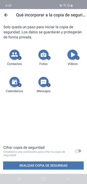 - Selecciona los tipos de datos que deseas que formen parte de la copia de seguridad.