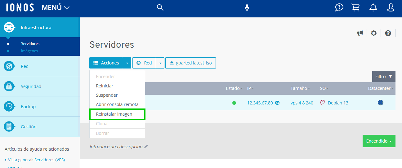 Es posible restaurar tu VPS instalando una imagen. Para ello, puedes utilizar tus propias imágenes o las imágenes proporcionadas por IONOS. En este artículo, te explicamos cómo reinstalar una imagen en un VPS existente: