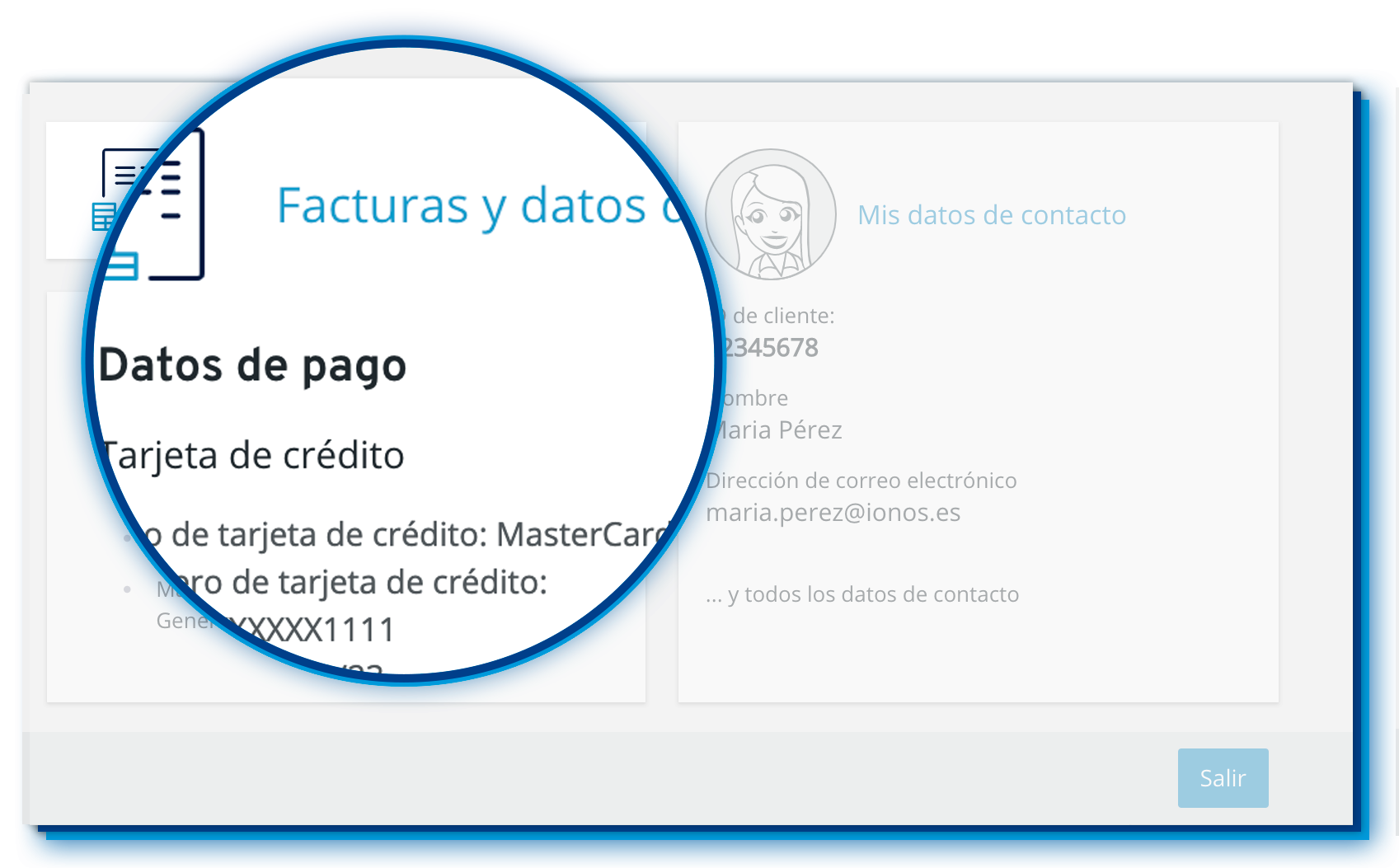 Acceda a sus facturas en cualquier momento y descárguelas como archivos PDF. Por supuesto, también le informaremos en esta área sobre abonos en cuenta o domiciliaciones fallidas. Además, en Detalles de pago puede actualizar fácilmente los datos bancarios de todos sus contratos en IONOS.