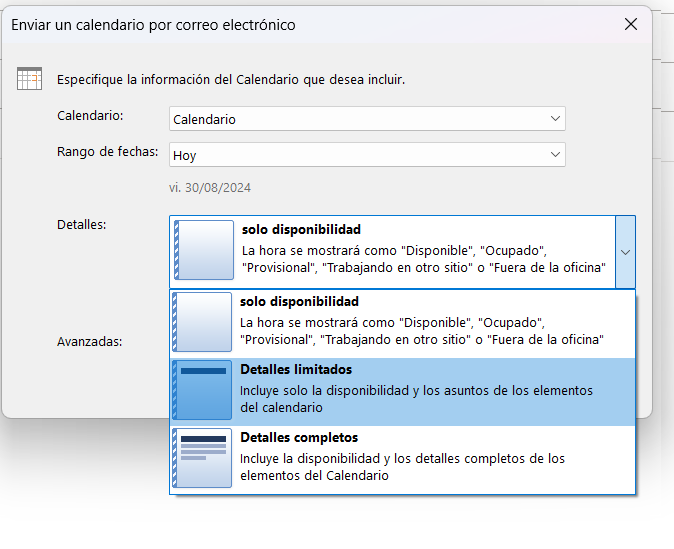 El administrador de tu red es el encargado de definir en las directivas de uso compartido la cantidad de datos que se comparten con personas externas. Si no se puede compartir el calendario de Outlook con los niveles de detalle deseados, se recibe un mensaje de error: ”Este calendario no puede compartirse”.