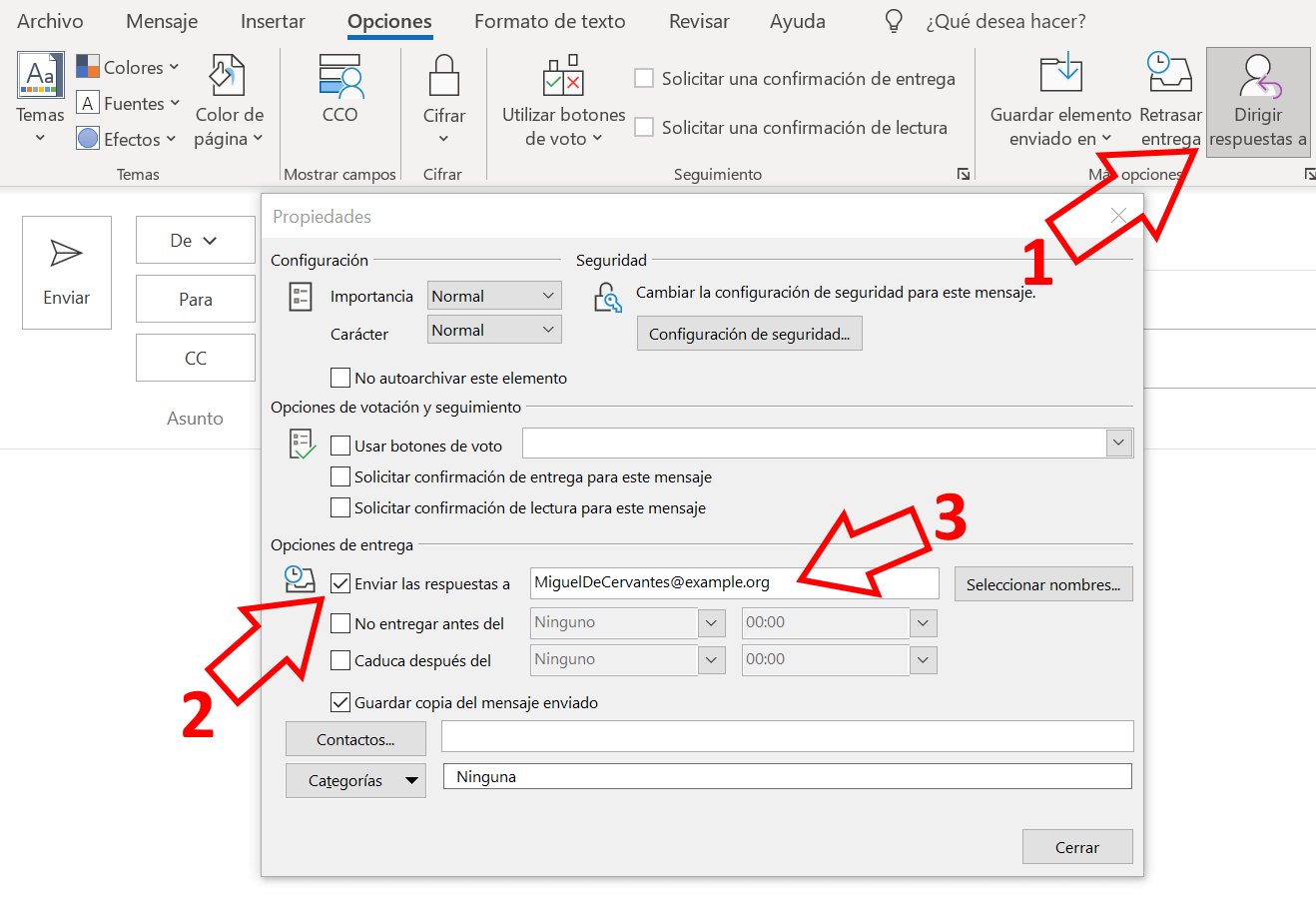 En “Propiedades”, marca la casilla “Enviar las respuestas a” (2) e introduce la dirección de correo que quieras (3) en ese campo. Podrás elegir de entre las direcciones de correo guardadas en “Seleccionar nombres…”. No obstante, también es posible introducir otras direcciones que desees (que sean válidas). Esto puede ser de gran utilidad si trabajas temporalmente desde casa o si estás fuera de la oficina; así el destinatario no se enterará de que escribes desde otra dirección de correo. Si el destinatario hace clic en el correo que ha recibido para responderte, en el campo “Para” aparecerá la dirección de respuesta.