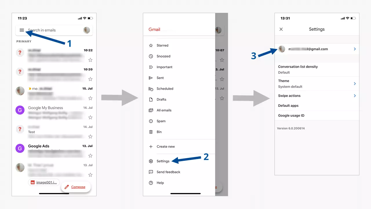 El cliente de correo electrónico de Google, Gmail, también está disponible como aplicación para dispositivos móviles. Aquí también tendrás que acceder a los ajustes para configurar la respuesta automática. En los dispositivos móviles, el usuario suele tener abierta su cuenta de Gmail, ya que el móvil está ya asegurado mediante otras técnicas, frente a la contraseña de la aplicación de escritorio.