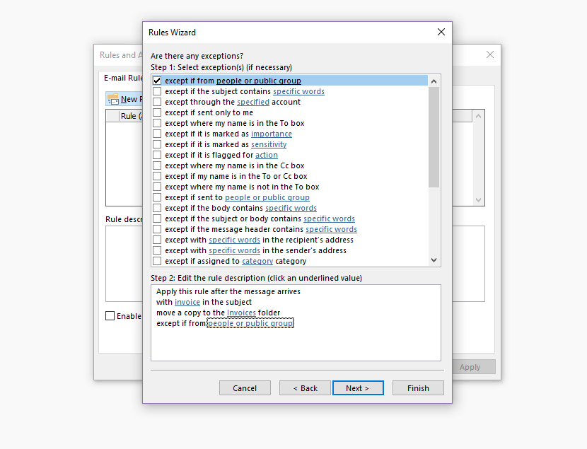 Paso 3: personaliza la regla de Outlook en el Asistente para reglas. Haz lo mismo que al crear una nueva regla: por ejemplo, añade condiciones o excepciones o edita la descripción de la regla.
