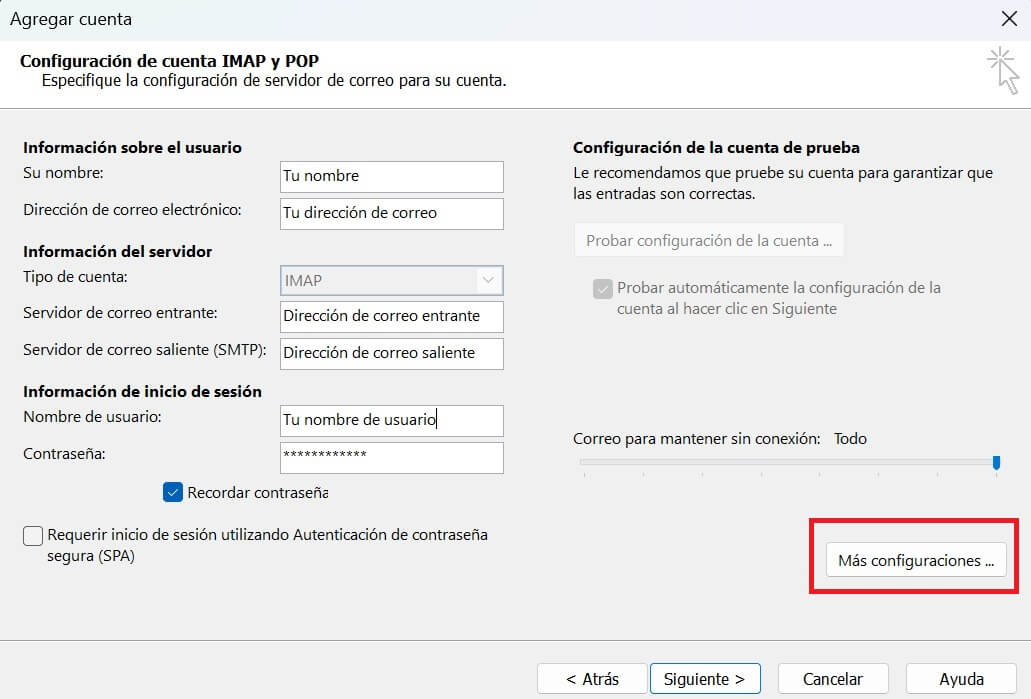- Haz clic en Cuentas de correo electrónico y, en la ventana siguiente, selecciona el buzón que quieras. Luego pulsa Cambiar para acceder a la configuración de cuentas POP e IMAP. No es necesario realizar cambios en esta pantalla. Simplemente, haz clic en Más configuraciones para ir al menú de destino Configuración de correo electrónico de Internet.