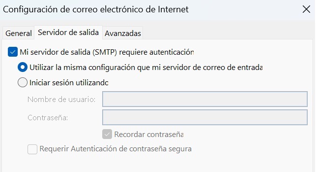 - A continuación, localiza la pestaña “Servidor de salida”. Si no está marcada, selecciona la opción “Mi servidor de salida (SMTP) requiere autenticación” para activar la autenticación SMTP en el cliente. Si además seleccionas “Utilizar la misma configuración que mi correo de entrada”, Outlook podrá trabajar con la información de registro habitual. Si la autenticación está activa, pero se ha definido un nombre de usuario y una contraseña nuevos que difieren del inicio de sesión predeterminado, tendrás que cambiar también la opción anterior para solucionar el mensaje “550 Relay not permitted”.