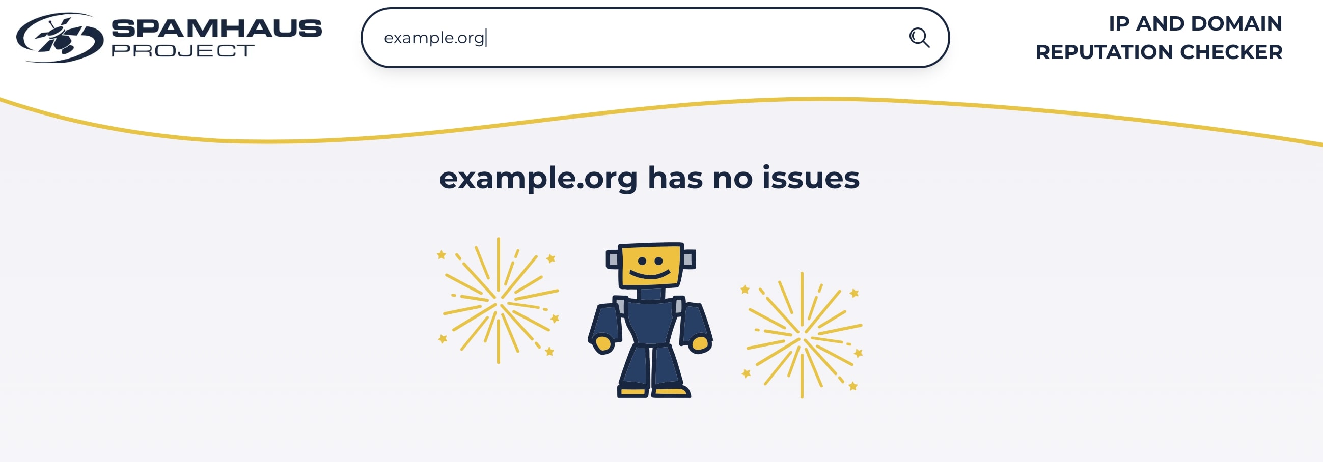 Al hacer clic en “Lookup” (Buscar), la herramienta busca en la base de datos “Domain block list” del proyecto Spamhaus, que contiene una lista de dominios de spam conocidos. En pocos segundos podrás saber si tu dirección está o no en la base de datos.