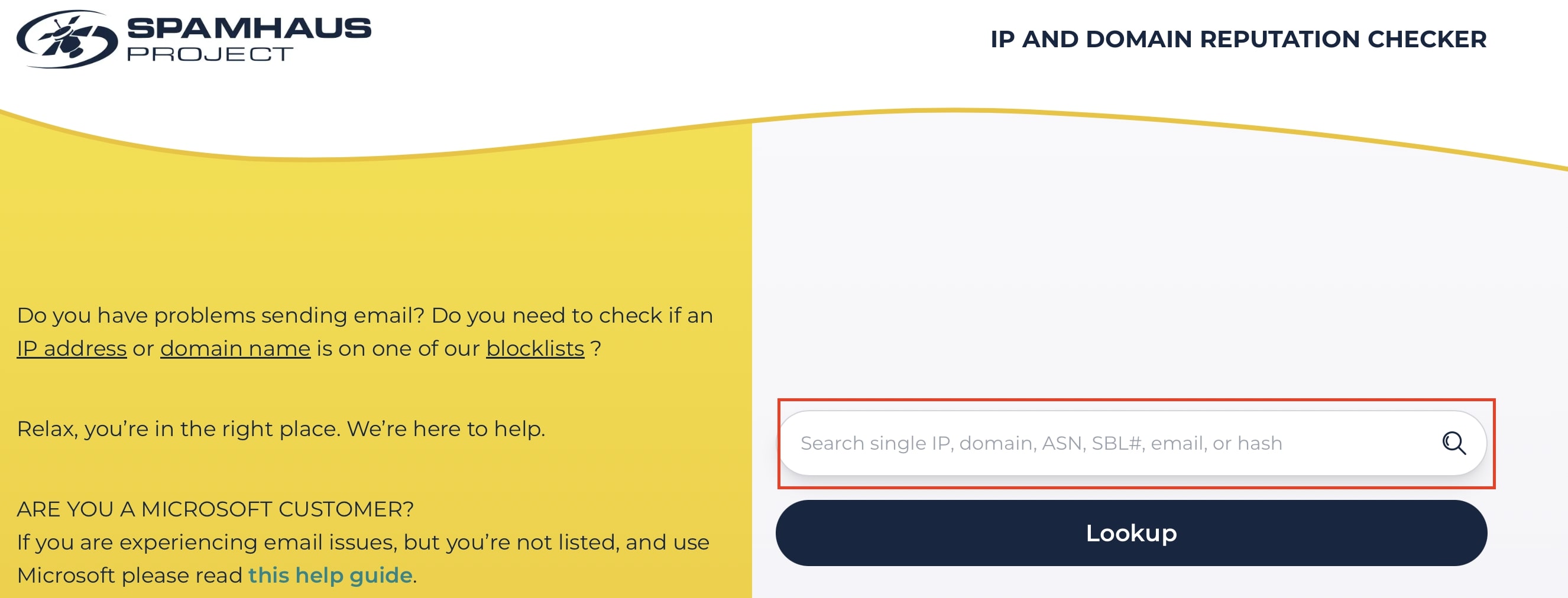 Para descartar la primera de las causas puedes utilizar herramientas para detectar las direcciones de email consideradas distribuidoras de correo spam como Blocklist Removal Center de Spamhaus. Para ello, accede a la aplicación web e introduce tu dirección de correo electrónico en el campo “Enter a Domain Name” (Introducir un nombre de dominio).