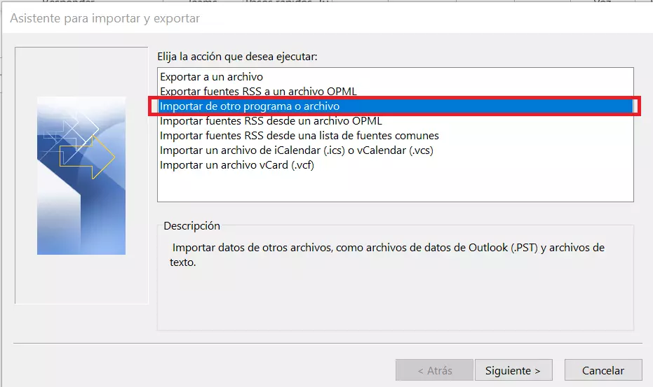 Paso 9. Para transferir los datos a Google, tomamos la carpeta que acabamos de guardar como archivo en Outlook mediante la importación de archivos. Para ello, vuelve al asistente tal y como acabamos de describir. Ahora, selecciona la opción “Importar de otro programa o archivo”. Lee el siguiente artículo para saber cómo puedes importar un archivo PST.