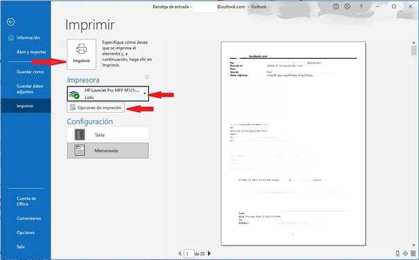 - Abrir el correo en Outlook y activar la impresión con la combinación de teclas [Ctrl] + [P]