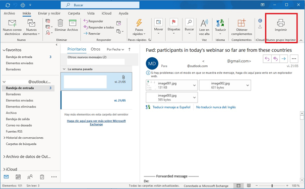 Esta es la forma clásica de imprimir correos en un ordenador que tiene el programa de Outlook instalado. El procedimiento es el siguiente: