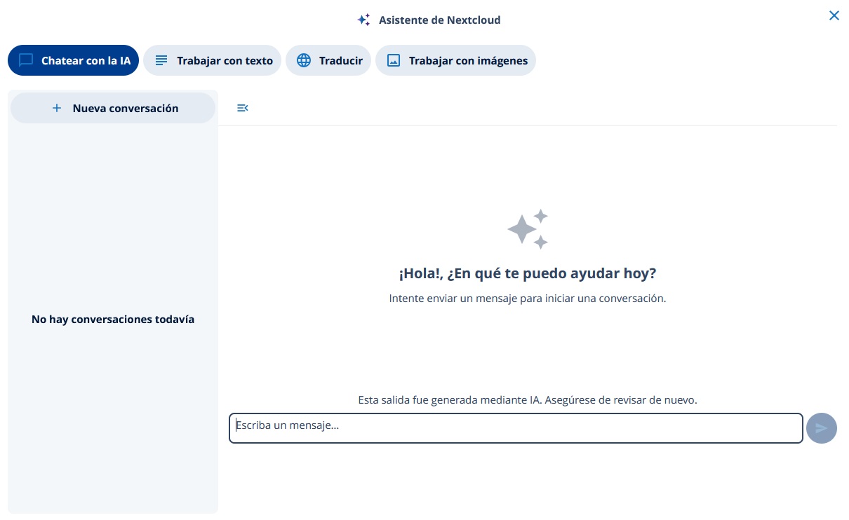 El módulo Assistant de Nextcloud Workspace se basa en inteligencia artificial y tiene como objetivo hacer más eficientes los procesos de trabajo diarios. El asistente puede resumir textos automáticamente, generar contenidos, ofrecer sugerencias de búsqueda inteligentes y ayudarte a organizar y analizar información con mayor rapidez. Además, la solución de IA se integra sin problemas en varias apps de Nextcloud como Talk, Mail o Files y ofrece recomendaciones o respuestas contextuales.