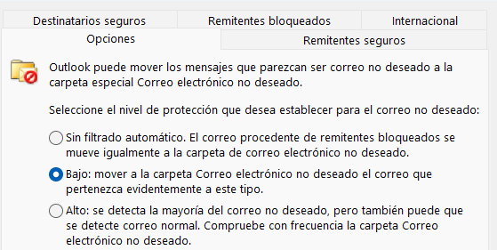 - Ajusta el nivel de filtrado en “Bajo” o “Alto“ para activar el filtro de spam en Outlook.