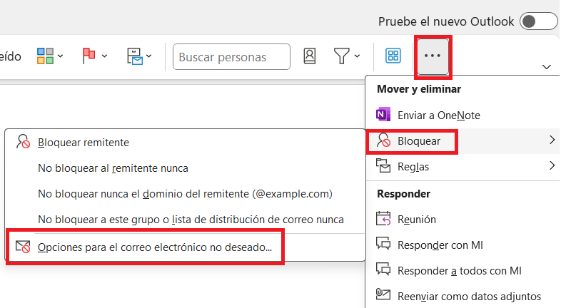 - Selecciona la opción “Opciones para el correo electrónico no deseado…”.