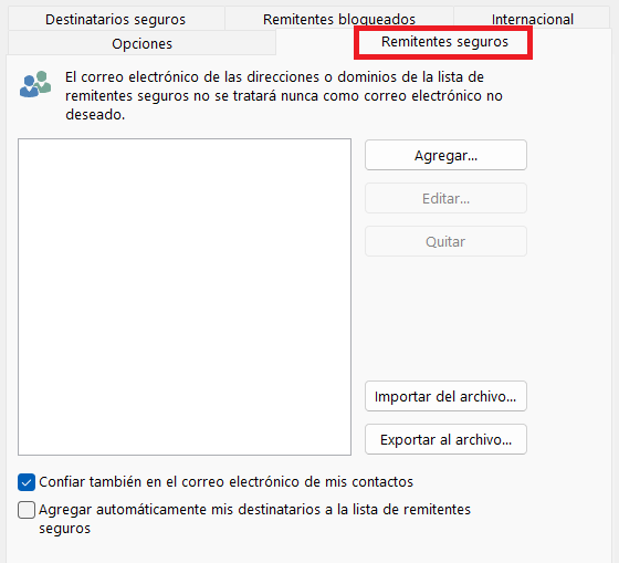 Para activar la lista de remitentes seguros, selecciona la opción “Solo listas seguras” en la configuración de correo no deseado. Luego, ve a la pestaña “Remitentes seguros” y añade las direcciones de correo de las que deseas recibir mensajes. Si marcas la opción “Confiar también en el correo electrónico de mis contactos”, Outlook añadirá automáticamente tus contactos guardados a la lista.