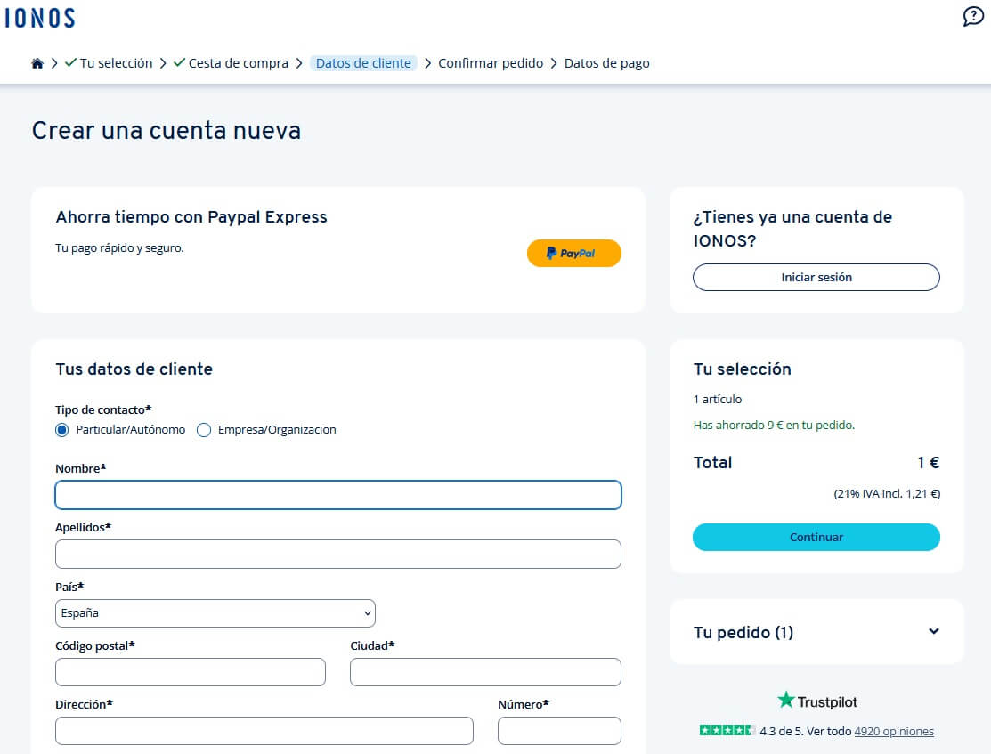 Después de hacer clic en “Continuar”, crea una cuenta IONOS o inicia sesión en tu cuenta activa de IONOS para continuar con el proceso de pago. También puedes abonar tu(s) dominio(s) directamente con PayPal o Google Pay.