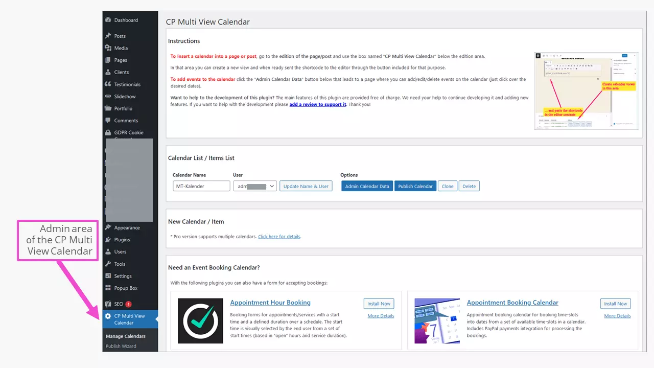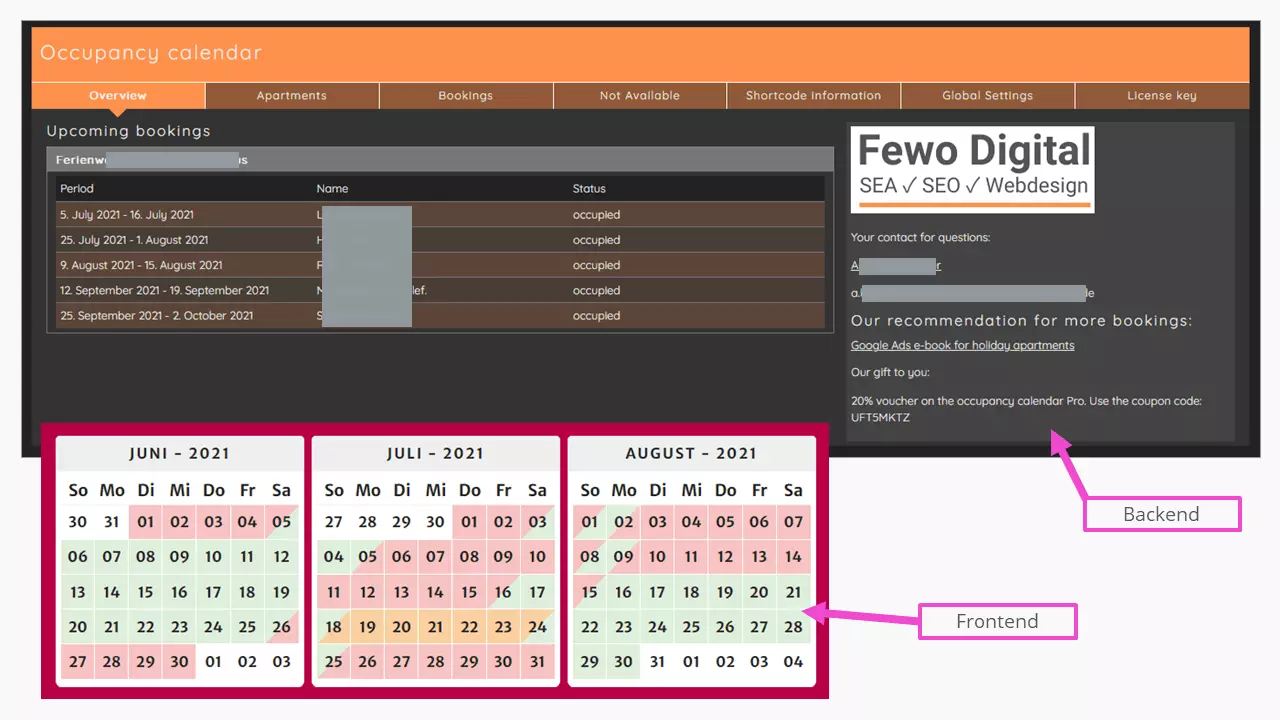 WP Simple Booking Calendar ofrece una gama muy limitada de funciones en su versión gratuita. La versión gratuita está pensada para mostrar, por ejemplo, la disponibilidad diaria de un alojamiento u oficina. Sin embargo, con la versión de pago se pueden crear calendarios sin limitaciones: es posible importar y exportar en formato iCalendar, y se ofrecen descripciones emergentes (tooltips) al pasar el cursor sobre un evento y leyendas personalizadas, entre muchas otras funciones. Todas las opciones están bien estructuradas en la página de demostración del desarrollador del plugin. Con el complemento Premium WP Booking System, incluso está disponible un sistema de reservas completo.