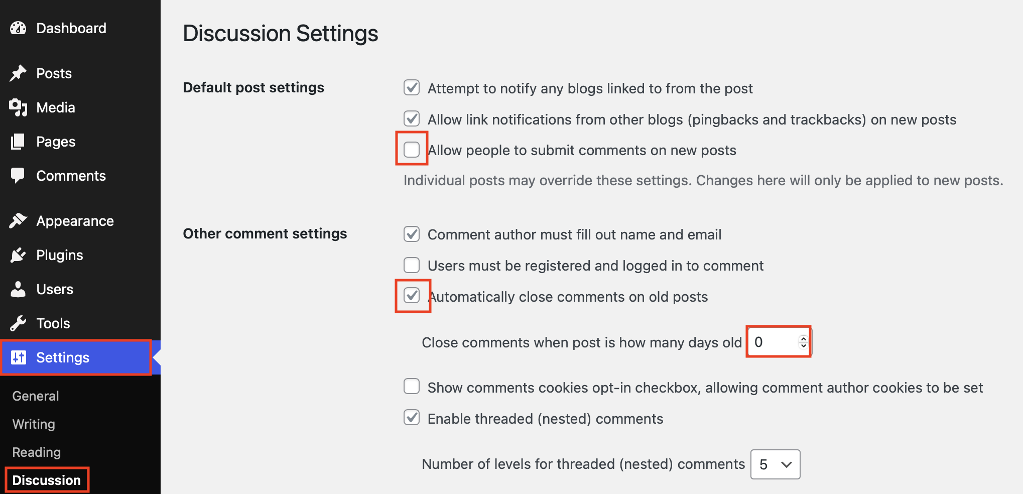Paso 3: marca la casilla junto a ”Cerrar automáticamente los comentarios en las entradas antiguas” (Automatically close comments on old posts). Para el número de días, pon un “0” en lugar de los “14” días sugeridos de forma predeterminada. Esto hace que los comentarios existentes se cierren de forma inmediata y dejen de ser visibles. Para activar todos los cambios, debes hacer clic en el botón “Guardar cambios” en la parte inferior de la página.