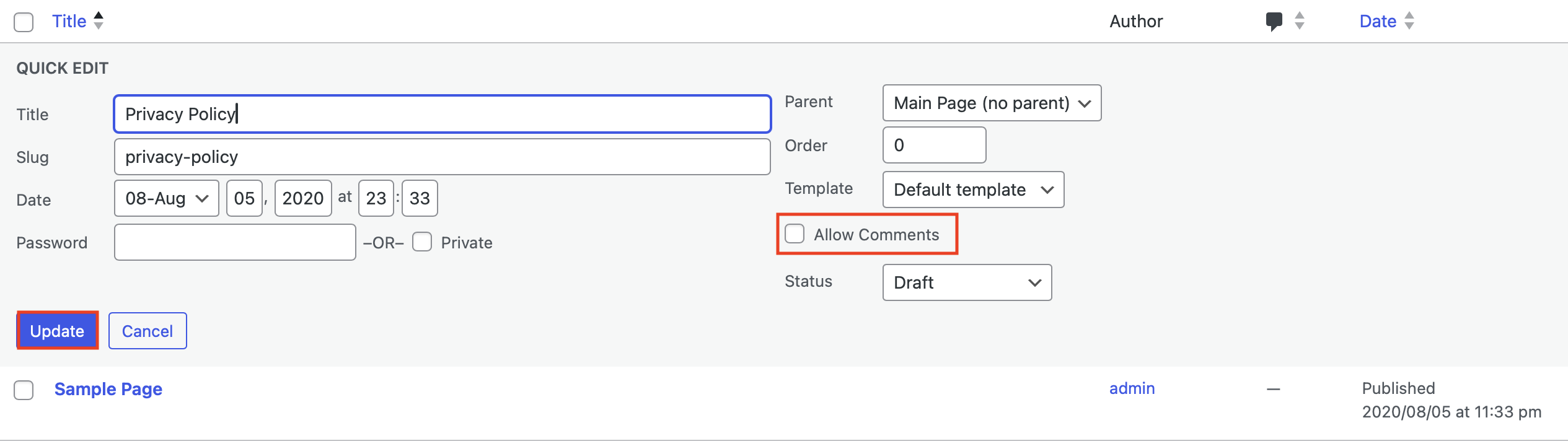 Paso 3: aparecerá el campo “Edición rápida” (Quick Edit), donde podrás hacer ajustes para la página en cuestión. Solo tienes que marcar la casilla “Permitir comentarios” (Allow Comments) y hacer clic en el botón azul “Actualizar” (Update). Con esto, activarás los comentarios para la página correspondiente. Si quieres desactivar los comentarios de WordPress, solo tienes que desmarcar la casilla de la página y, de nuevo, hacer clic en “Actualizar” (Update).