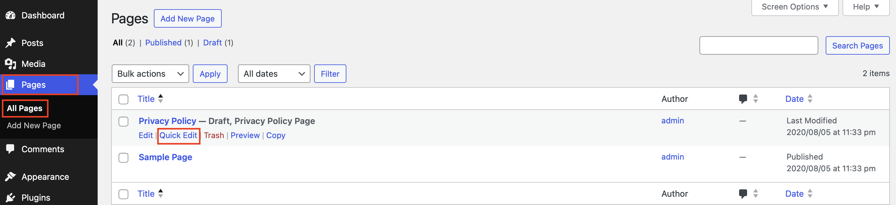 Paso 1: accede a una página o entrada específica en el backend de WordPress. Primero, ve a “Páginas” o “Entradas” y, luego, a “Todas las páginas” o “Todas las entradas”. A continuación, aparecerá una lista con todas las páginas o entradas. Haz clic en el nombre de la página o entrada para la que quieras cambiar la función de comentarios.