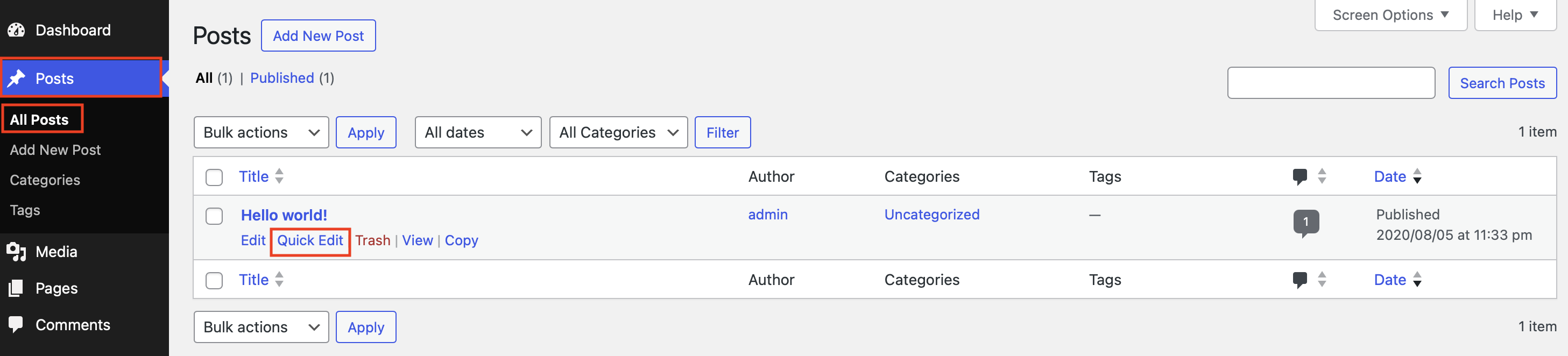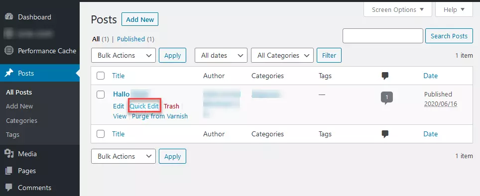 Paso 2: mueve el cursor sobre cada una de las entradas en las que quieras desactivar los comentarios. Aparecerán los campos “Editar”, “Edición rápida”, “Papelera”, “Ver” y “Copiar”. Haz clic en “Edición rápida” (Quick Edit).