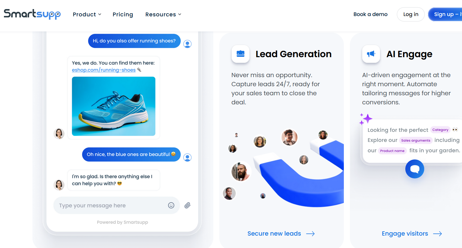 Para facilitar la interacción con los usuarios de tu página, el plugin de WordPress Smartsupp aprovecha, entre otros, los beneficios de la inteligencia artificial. Los asistentes de ventas y atención al cliente basados en IA permiten automatizar la atención al cliente en línea y ofrecerla las 24 horas del día. Además, cuenta con la función AI Engage, que muestra automáticamente mensajes personalizados en el navegador de los usuarios cuando se han recopilado suficientes datos relevantes para recomendar productos o servicios específicos. Toda la información se almacena en servidores de la UE, en cumplimiento con el RGPD, y la comunicación en el chat está cifrada con AES de 256 bits.