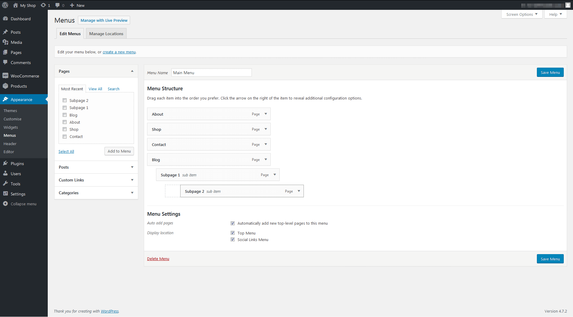 La usabilidad es clave para el éxito de tu tienda. WooCommerce crea automáticamente un menú de navegación principal con las secciones básicas “Tienda”, “Carrito”, “Finalizar compra” y “Mi cuenta”. Puedes personalizar y ampliar estas secciones en el “Editor del sitio” dentro de “Apariencia”.