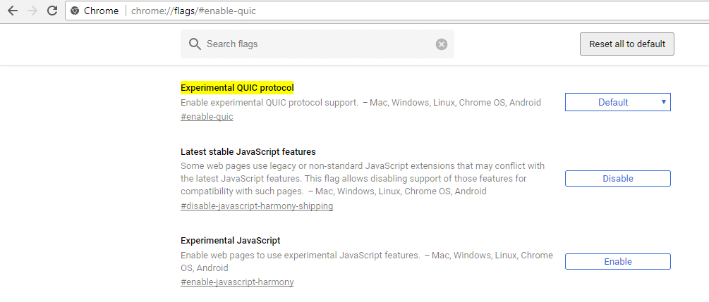 Google Chrome fue uno de los primeros navegadores en implementar QUIC. Como protocolo TCP alternativo, este tiene por objeto, entre otras cosas, proporcionar velocidad adicional a la hora de establecer una conexión. Aunque oficialmente se encuentra en fase de prueba, ya está activado por defecto como "protocolo experimental" en varios servicios de Google, incluido Chrome, lo que puede provocar un error ERR_SSL_PROTOCOL_ERROR. Para resolver este problema, a veces basta con desactivar QUIC. Para ello, introduce la siguiente ruta en la barra de navegación: