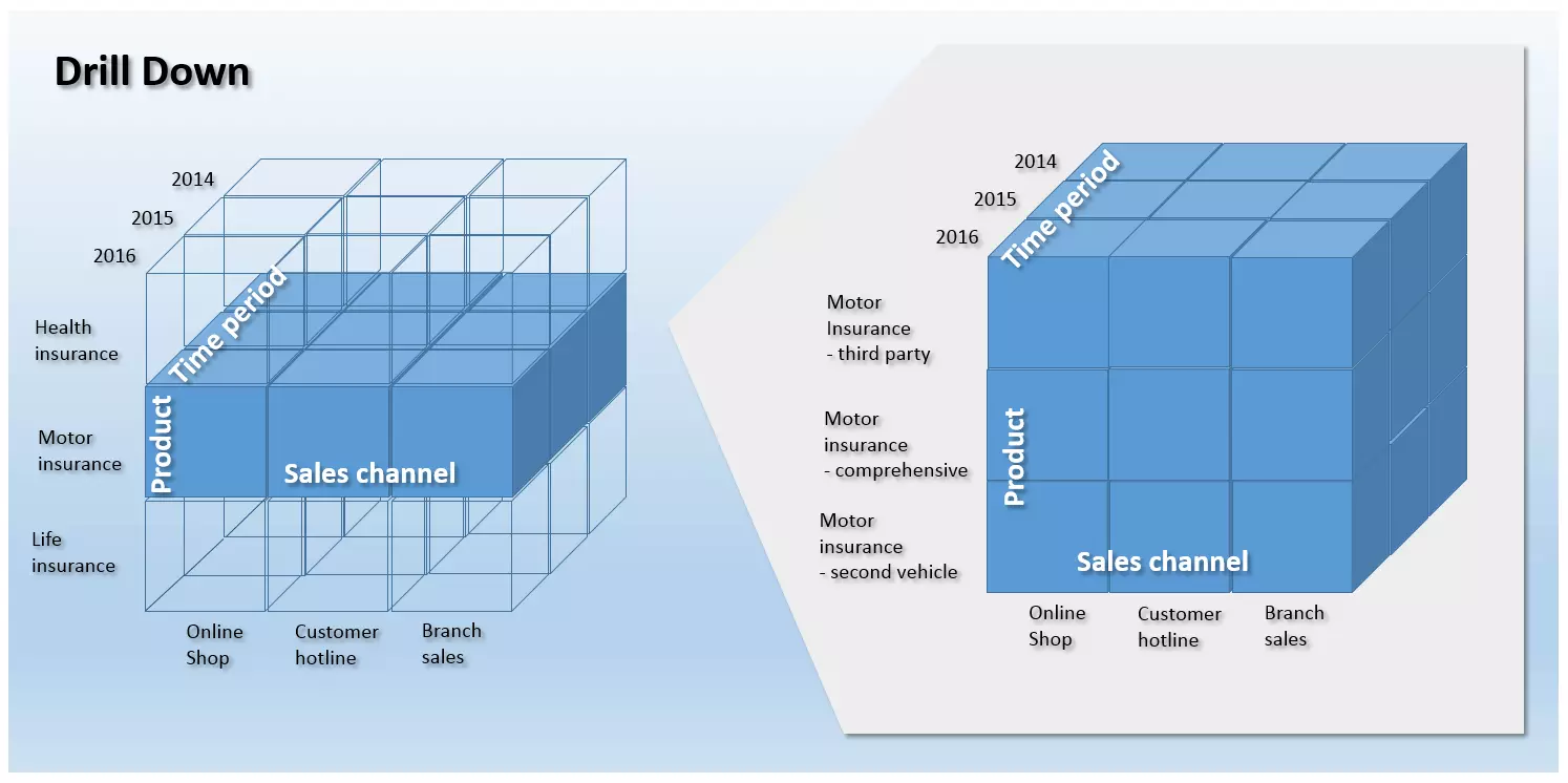 Drill down/Roll up: cuando las variables de un objeto se deben desglosar a valores aún más detallados se utiliza la operación drill down, que permite a los analistas ampliar una sección del cubo OLAP para aumentar su grado de detalle. La operación inversa se denomina roll up y en ella se compacta la información a niveles más altos de la jerarquía. Ambos se utilizan en la navegación en estructuras jerárquicas multidimensionales.