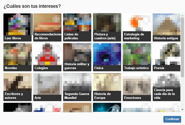 En un primer paso, se ha de seleccionar una serie de temas por los que el usuario sienta algún tipo de afinidad o interés. En función de los temas que se escogen se va ampliando la selección, puesto que surgen categorías secundarias con las que se pueden precisar aún más las áreas de expertise.