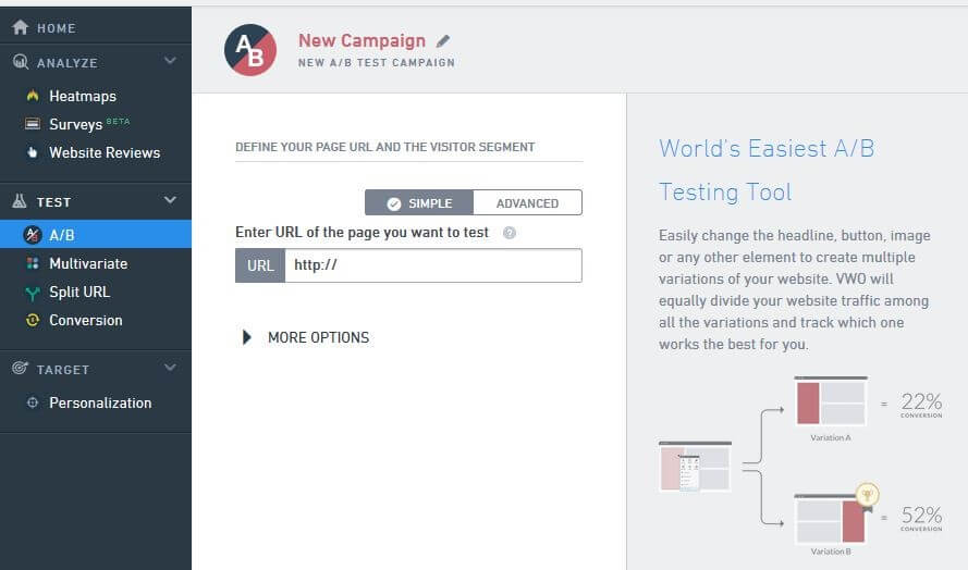 Visual Website Optimizer (abreviado como VWO) se cuenta entre las testing tools pioneras. El equipo de desarrolladores indio Wingify publicó su software ya en 2010 y desde entonces se han desarrollado más de 300.000 campañas de prueba. La aplicación va dirigida tanto a autónomos y pymes como a grandes empresas, lo que se refleja en sus tres modelos de suscripción: los planes estándar Startup (alrededor de 40 euros/mes para 10.000 visitantes) y Business (desde 110 euros/mes para a partir de 30.000 visitantes) contienen todas las características necesarias para bloggers, agencias y pequeñas empresas. Las grandes empresas recurren al plan Enterprise (desde de 870 euros/mes para un gran número de visitantes), con el que reciben funciones útiles adicionales como geo targeting (geolocalización) o acceso API.