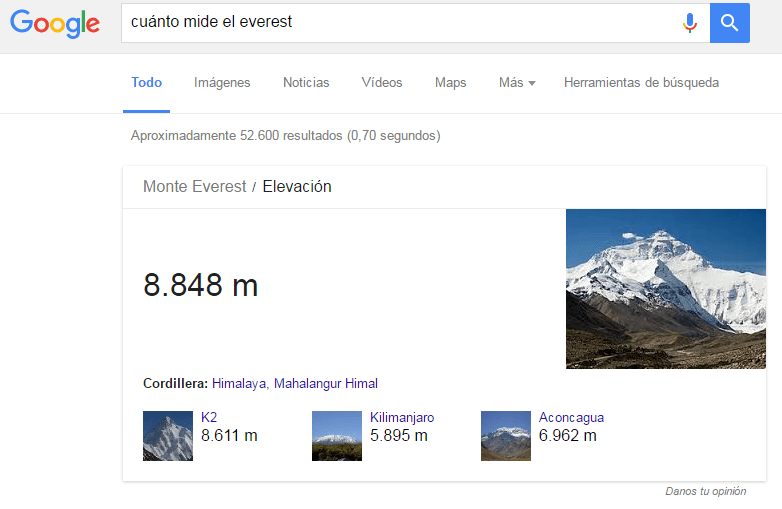 En ese entonces solo se mostraban resultados orgánicos y, hasta hace unos años, Google mostraba máximo diez resultados por búsqueda. Actualmente, como lo muestra la siguiente imagen, los resultados de búsqueda de Google han cambiado notablemente: