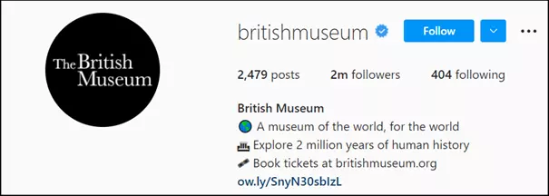 Las salas de exposiciones, los conciertos o los museos causan una buena impresión cuando indican lo que ofrecen y añaden opciones de reserva. La biografía de Instagram del British Museum describe la misión del museo mediante el uso de emojis/símbolos y un enlace para reservar entradas.