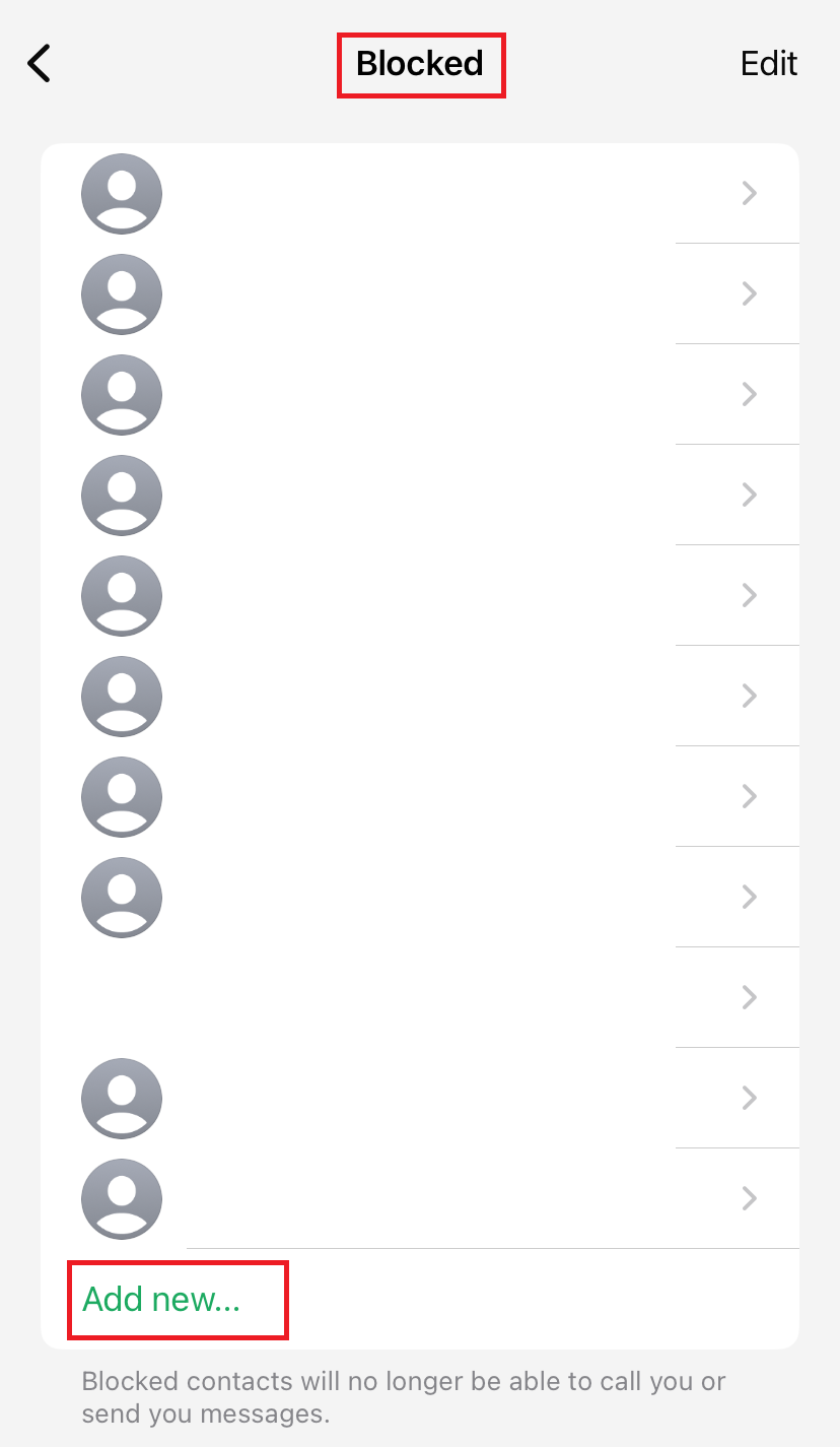 Paso 4: debajo de “Contactos bloqueados” (Blocked) verás una lista de todos los contactos bloqueados anteriormente (si los hay). Para añadir un contacto existente a la lista de contactos bloqueados, toca el icono de persona con el signo más en la esquina superior derecha y selecciona el contacto en cuestión de la lista.