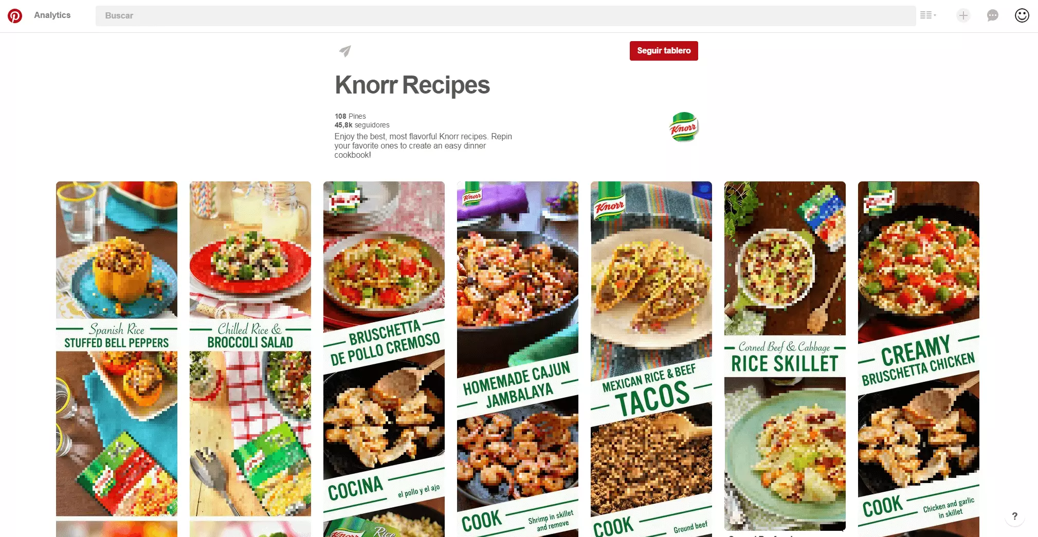 Otro perfil con mucho éxito en Pinterest es el de la empresa dedicada a la fabricación de sopas y cremas Knorr. Cada tablero sigue una línea clara: todas las recetas están identificadas de forma homogénea, así como las fotos tienen un look coherente.