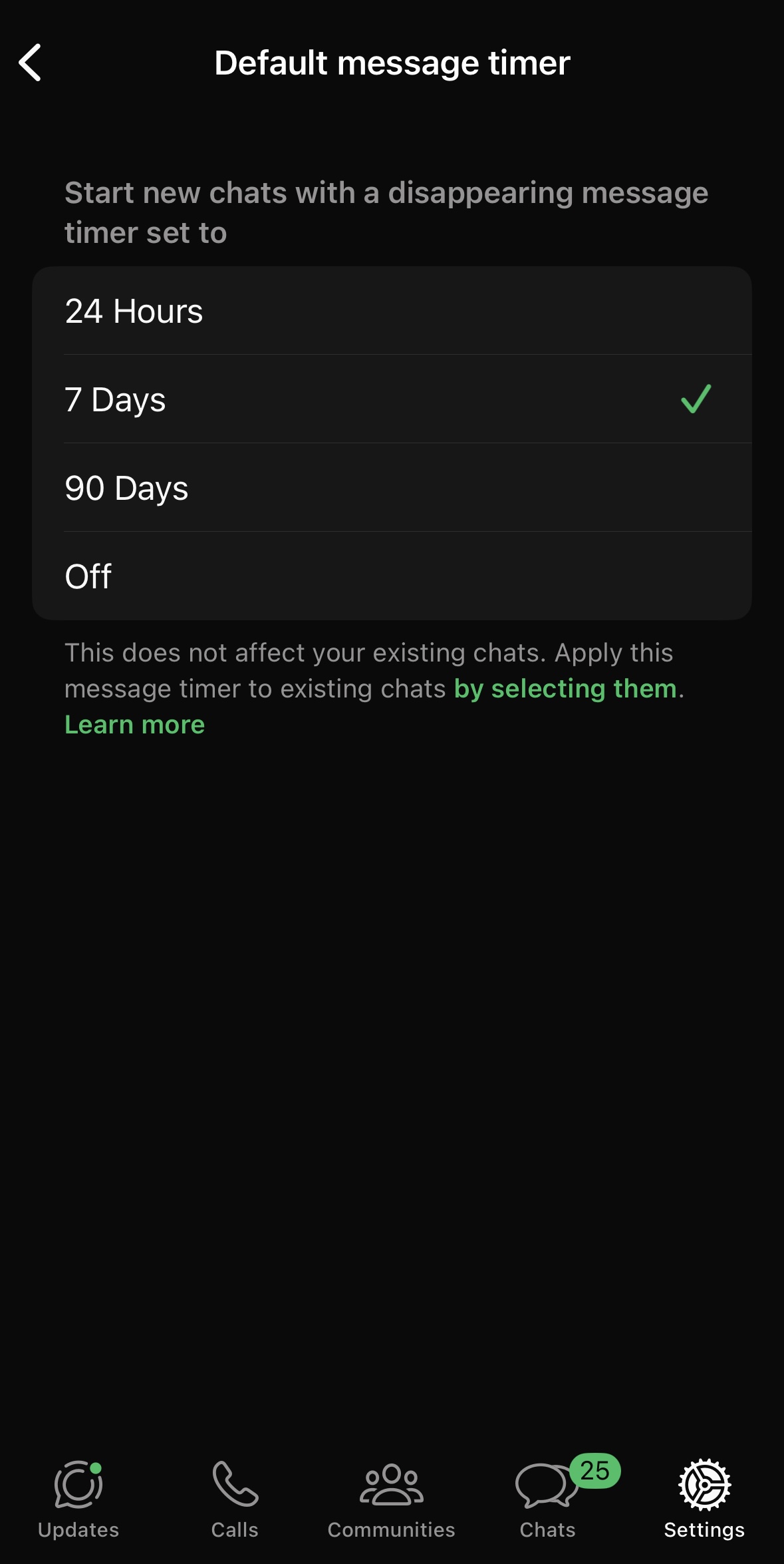 - Selecciona el periodo de tiempo deseado, y todos los nuevos chats aplicarán automáticamente esta configuración.
