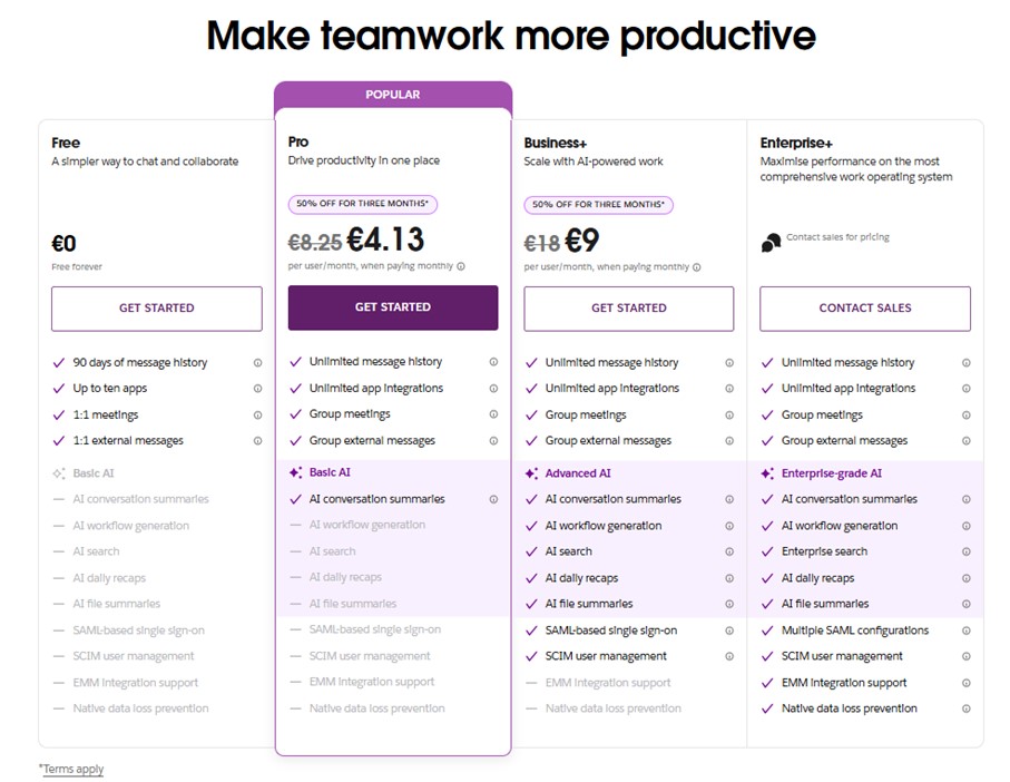 Para equipos con mayores necesidades, existen planes de pago como el plan Pro (desde unos 8,25 € por persona/mes) y el plan Business+ (desde unos 18 € por persona/mes). También se pueden solicitar ofertas personalizadas para planes Enterprise. La versión de pago de Slack ofrece, entre otras cosas, archivo de mensajes ilimitado, mayor capacidad de almacenamiento, soporte 24/7, inicio de sesión único basado en SAML (SSO) y funciones avanzadas de seguridad y administración. Por 10 € por persona/mes, también se puede añadir Slack con IA, que puede utilizarse, por ejemplo, para la creación automatizada de flujos de trabajo o la generación de resúmenes de reuniones (conocidas como huddles).
