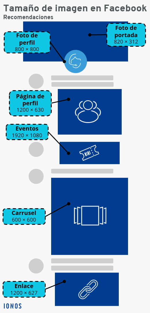 Si quieres publicar imágenes en la página de perfil, te recomendamos unas dimensiones de 1200 x 630 píxeles. Para las imágenes en formato vertical, sirven 1200 x 1500 píxeles. Se aplica la relación de aspecto máxima 1:1,5. Ten en cuenta que las imágenes de Facebook con dimensiones incorrectas se recortarán o se ajustarán. Como las imágenes de la página de perfil son como una crónica de tus actividades y acciones, es especialmente importante asegurarse de que tengan las dimensiones correctas.