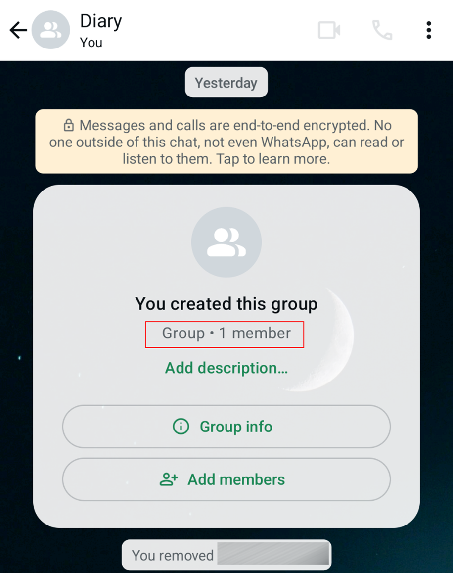 En primer lugar, tienes que crear un grupo de WhatsApp. Añade un contacto a este grupo como miembro, al que idealmente deberías informar de tu intención de antemano. Después de crear el chat, elimina el contacto en la ventana de información del grupo y cambia el nombre del grupo, por ejemplo, a “Diario”. Tu chat privado estará listo para ser usado.