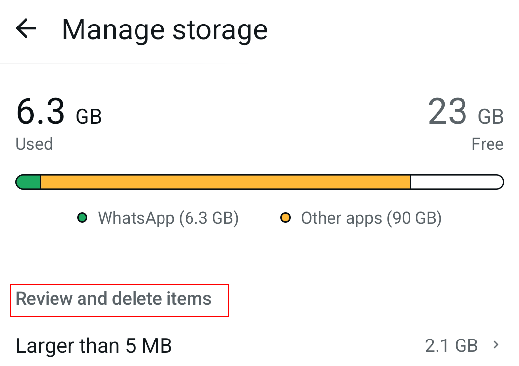 En los ajustes de WhatsApp, selecciona “Almacenamiento y datos” y luego “Administrar el almacenamiento”. Ahora verás una lista de tu espacio de almacenamiento de WhatsApp utilizado, los archivos con más de 5 MB y tus chats. Elimina el contenido que ocupa mucho espacio y/o que ya no necesitas.
