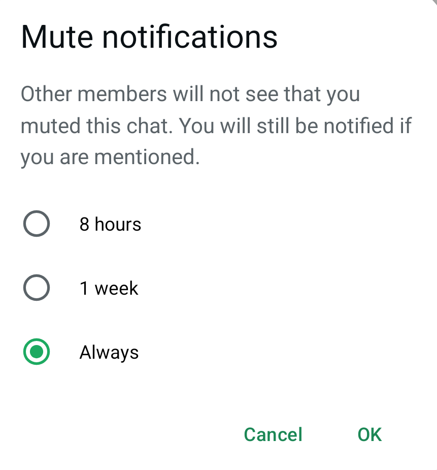 Para ello, primero selecciona el chat que quieres silenciar. A continuación, en Android, pulsa “Silenciar notificaciones” en el menú de tres puntos. En iOS, encontrarás esta opción en la ventana de información del grupo o del contacto. También puedes mantener el dedo pulsado en un chat y luego activar el silencio. Una característica práctica: puedes elegir entre silenciar durante ocho horas, una semana o de forma indefinida.