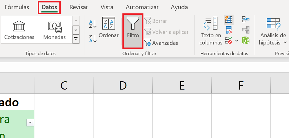 - Haz clic en “Filtro”, situado en la sección “Ordenar y filtrar”.