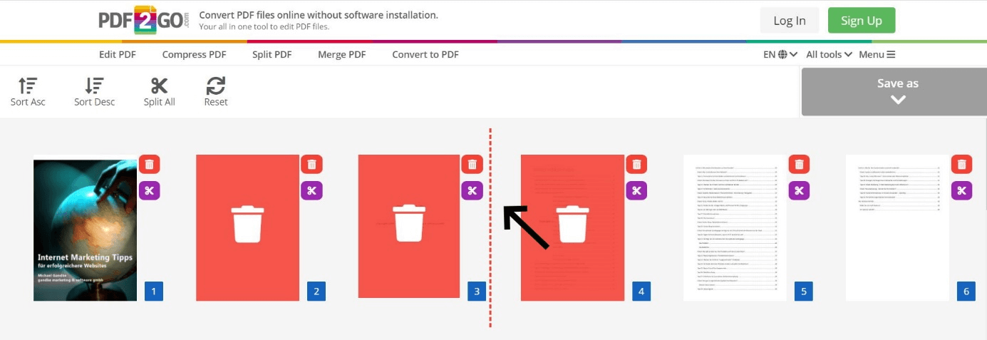 PDF2GO también te permite dividir un PDF en varios documentos de una sola vez. Para esto, haz clic en el icono de las tijeras. El punto de corte se marcará con una línea roja. Al exportar, recibirás los archivos PDF correspondientes por separado.