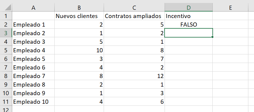 En nuestra tabla de ejemplo, puedes emplear la función SI para definir estas condiciones: si un empleado consigue al menos cinco nuevos clientes, recibirá un incentivo de 100 euros. Si el empleado no alcanza el objetivo, no obtendrá ningún incentivo. La fórmula SI quedaría de la siguiente manera: