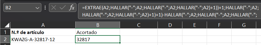 =EXTRAE(A2;HALLAR(“-“;A2;HALLAR(“-“;A2;HALLAR(“-“;A2)+1))+1;HALLAR(“-“;A2;HALLAR(“-“;A2;HALLAR(“-“;A2)+1)+1)-HALLAR(“-“;A2;HALLAR(“-“;A2;HALLAR(“-“;A2)-1))-3)