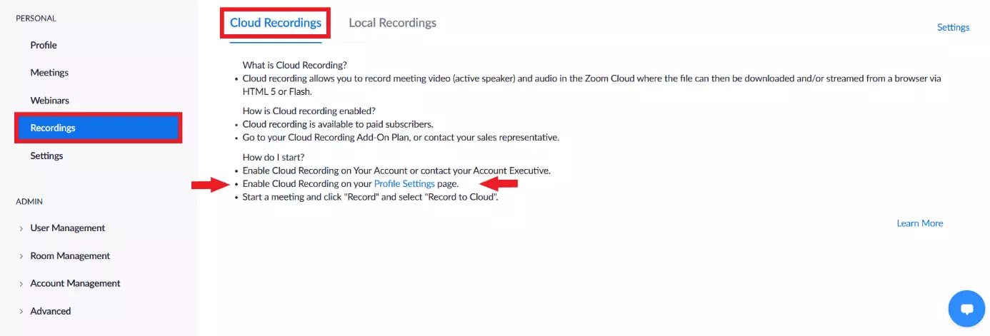 Paso 2. Selecciona “Grabaciones” en la barra lateral izquierda y luego la pestaña “Grabaciones en la nube”. Si aún no lo has hecho, activa la grabación en la nube haciendo clic en “Configuración del perfil” y navegando hasta la sección “Grabaciones en la nube”.