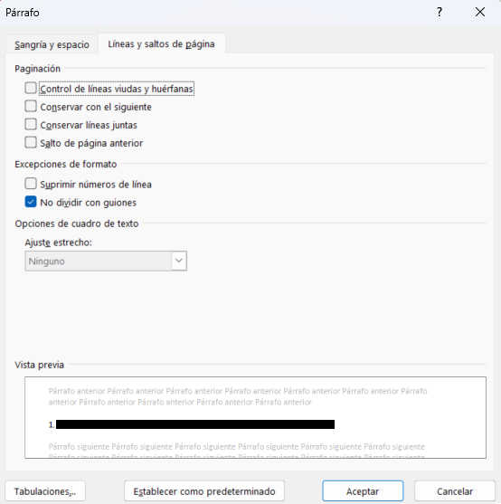 - Marca la casilla “No dividir con guiones” y confirma pulsando “Aceptar”.