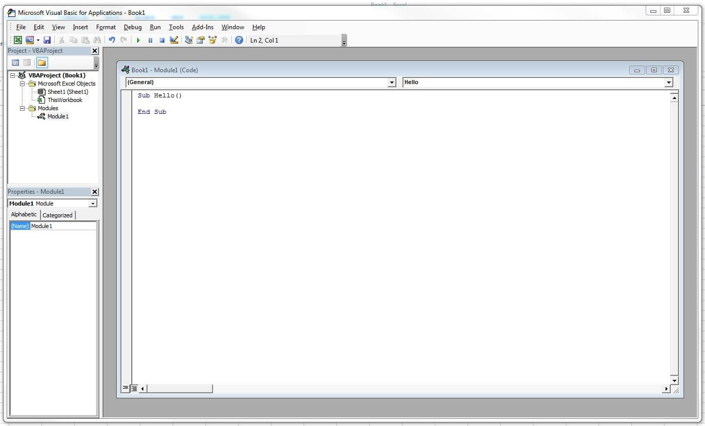 A continuación se crea un libro que sirva de base a las macros registradas. Para ello, haz clic en Macros en la pestaña Developer y cuando aparezca la ventana emergente introduce el nombre de la primera macro –en este ejemplo “Hello”– en Macro Name. Confirma haciendo clic en Create (Crear), a lo que se abre el editor Visual Basic con el siguiente código: