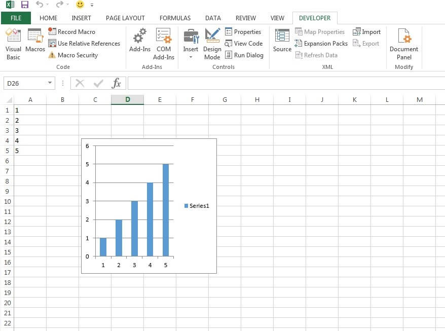 End SubSi, a continuación, a modo de prueba, introduces los valores del 1 al 5 en las celdas A1-A5 y ejecutas la macro, Excel presenta los datos introducidos como un gráfico de barras por defecto, al no haber proporcionado ninguna información al respecto, que se haría mediante la variable ChartType.